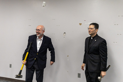 Scott Bieler and the Rev. James J. Maher, C.M., Niagara University president, kick off the transformation of Bisgrove Hall’s first floor into the Scott Bieler Institute for Ethical Leadership and Innovation with a ceremonial wall breaking.